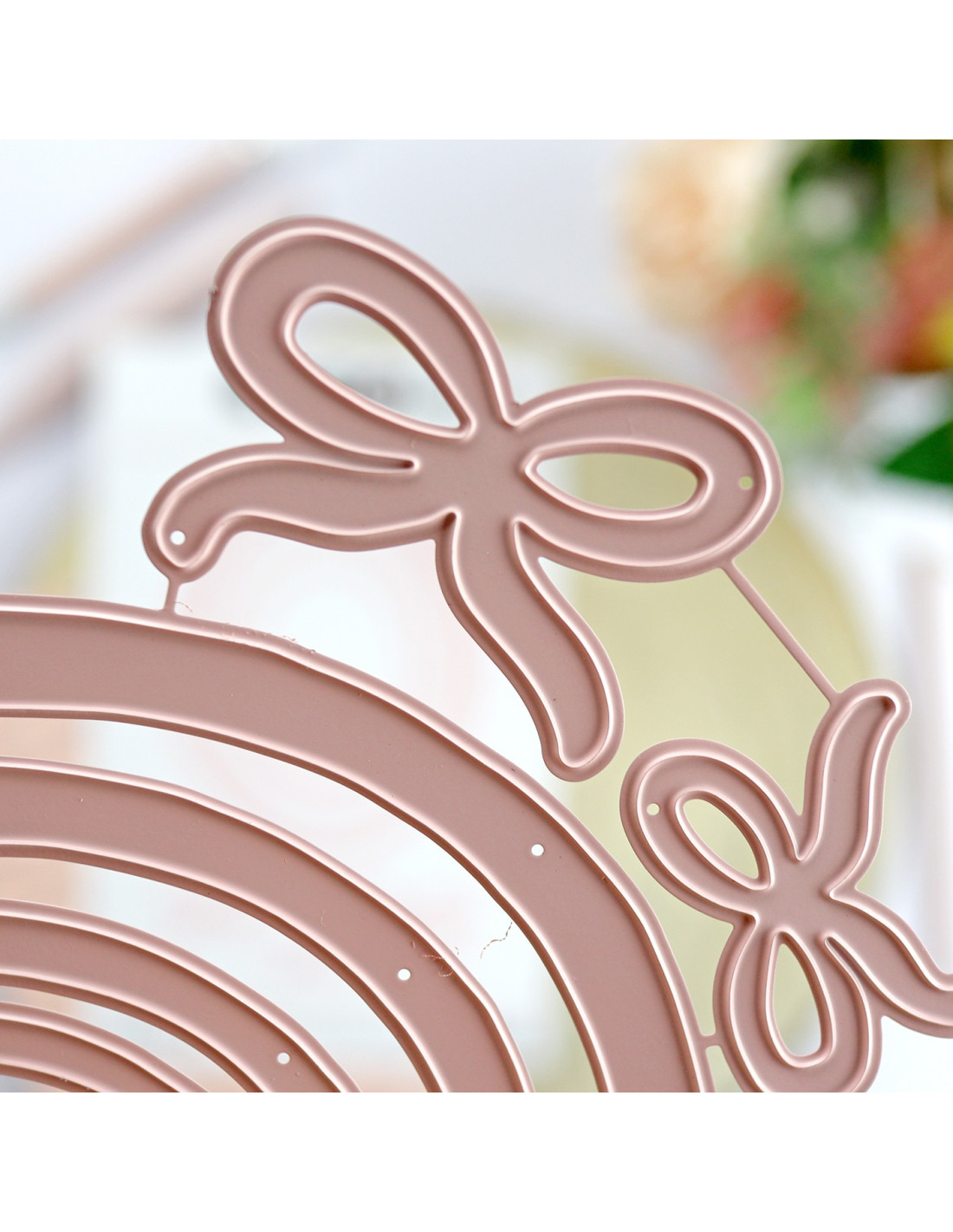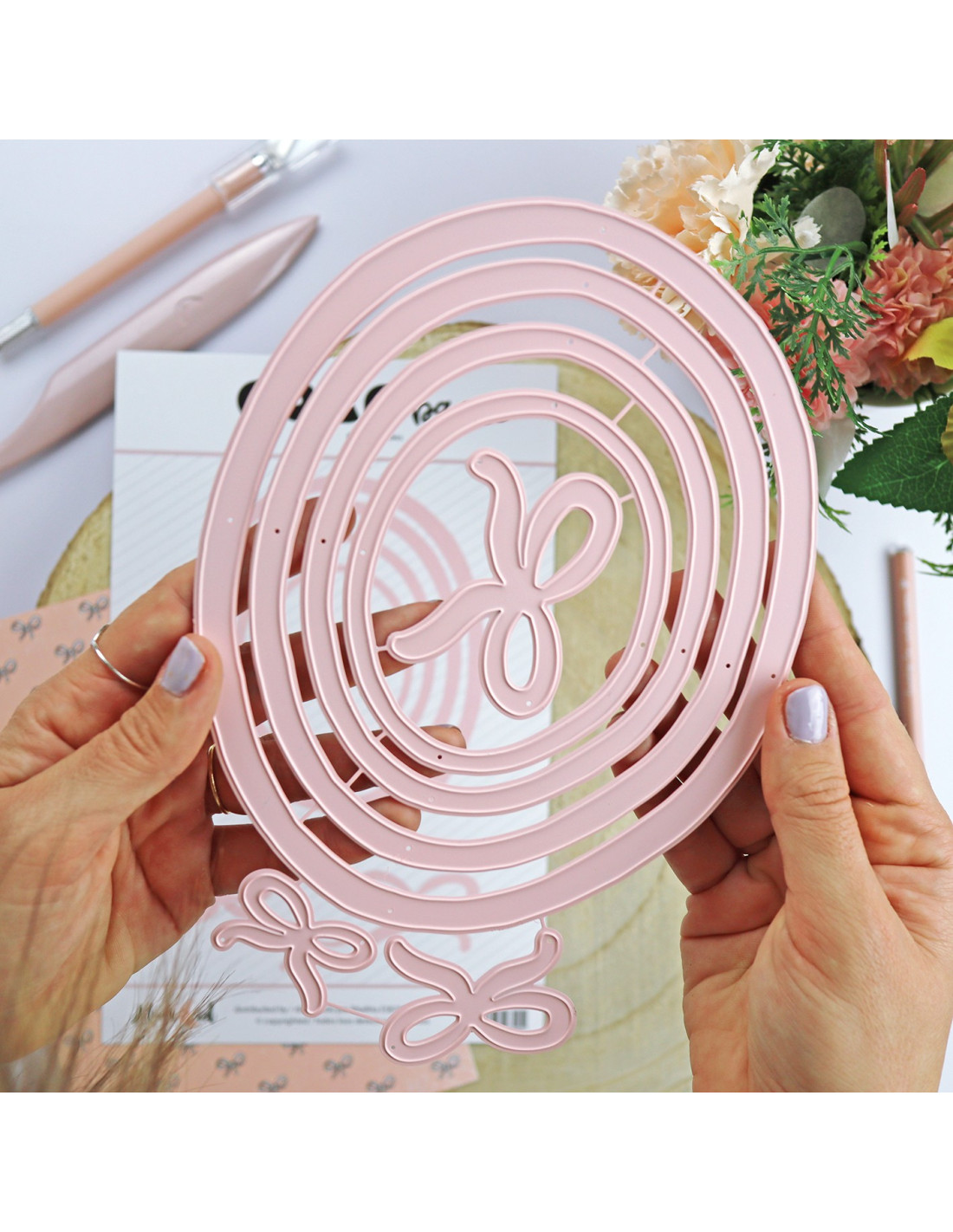 This set includes 4 oval frame-shaped dies to cut paper or cardboard with the help of a die cutter. In addition, the set comes complete with 3 bows of different sizes to decorate the frames.